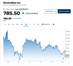 서비스나우(NYS:NOW)의 최근 주가 급락은 투자자들에게 매력적인 진입 기회를 열어줬다고 투자은행 번스타인이 분석했다.17일(현지시간) CNBC에 따르면, 번스타인은 보고서에서 서비스나우에 대한 '시장수익률 상회(Outperform)' 등급을 유지하며 "대형 소프트웨어 주식 중 가장 저렴한 종목"이라고 평가했다.피터 위드 번스타인 애널리스트는 과거 자신이 서비스나우를 '차기 마이크로소프트'라고 칭했던 점을 언급하며 이 기업에 대해 '가장 저렴하다'는 수식어를 붙이게 될 줄은 몰랐다고 말했다.서비스나우는 사이버보안 스타트업 아미스