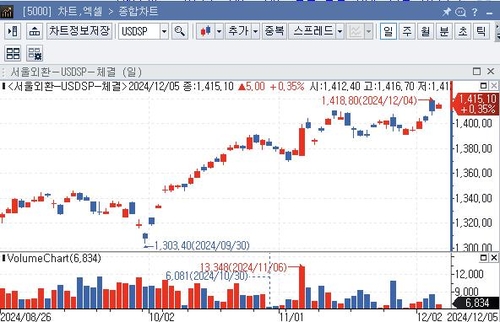 (서울=연합인포맥스) 비상계엄 사태 이후 이틀(4일~5일) 동안 유가증권시장에서 코스피지수는 2,500선에서 2,442선으로 2.3% 하락했다. 달러-원 환율은 종가 기준으로 1,402.90원에서 1,415.10원으로 12.20원 올랐다. 이번 사태가 금융시장에 부정적인 영향을 미치고 있지만, 당초 우려에 비해선 파장이 제한적이란 평가가 나온다.