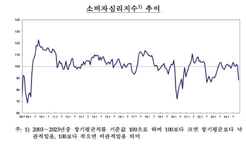 한국은행이 24일 발표한 '2024년 12월 소비자동향조사 결과'에 따르면 소비자심리지수(CCSI)는 전월보다 12.3포인트 급락한 88.4를 기록했다. 이는 2020년 3월 코로나19 팬데믹(-18.3p) 이후 최대 낙폭이다.