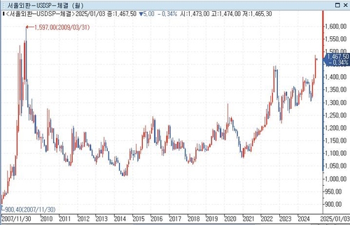 (서울=연합인포맥스) 2024년 서울외환시장의 마지막 거래일이었던 지난달 30일 달러-원 환율은 전일보다 5.00원 상승한 1,472.50원에 장을 마쳤다. 연말 종가 기준으로는 지난 1997년 이른바 IMF 외환위기 이후 가장 높은 수준이다. 유가증권시장에서 코스피지수도 2,400선을 내주면서 2,399.49로 장을 마감했다. 지난해 미국과 대만, 일본 등 주요국 주가지수가 적게는 20%, 많게는 30% 가까이 상승한 상황에서 코스피지수는 10%, 코스닥지수는 20% 정도 하락한 초래한 실적이다.
