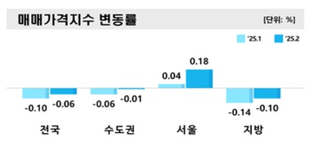 수도권은 0.01% 떨어졌고 지방은 0.1% 하락했다.