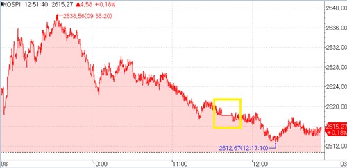 이번 원인을 알 수 없는 오류로 7분여 동안 코스피 시세도 움직임을 멈췄다.