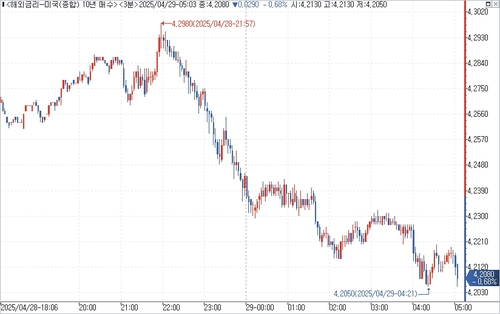 연합인포맥스의 해외금리 일중 화면(화면번호 6532)에 따르면 28일(미국 동부시간) 오후 3시 현재 뉴욕 채권시장에서 10년물 국채금리는 직전 거래일 오후 3시 기준가보다 5.00bp 하락한 4.2170%에 거래됐다.