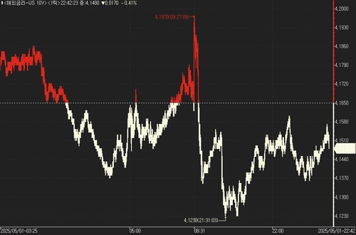 연합인포맥스의 해외금리 일중 화면(화면번호 6532)에 따르면 1일(미국 동부시간) 오전 9시 현재 뉴욕 채권시장에서 10년물 국채금리는 전 거래일 오후 3시 기준가보다 2.70bp 내린 4.148%를 기록하고 있다.