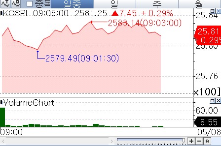 8일 연합인포맥스 신주식 종합(화면번호 3536)에 따르면 오전 9시 5분 기준 코스피는 전 거래일보다 7.45포인트(0.29%) 상승한 2,581.25에 거래되고 있다.