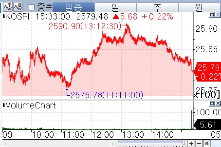 8일 연합인포맥스 신주식 종합(화면번호 3536)에 따르면 코스피는 전 거래일보다 5.68포인트(0.22%) 상승한 2,579.48에 장을 마쳤다.