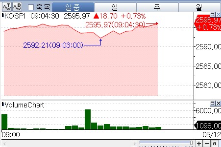 12일 연합인포맥스 주식종합(화면번호 3536)에 따르면 오전 9시 4분 기준 코스피는 전 거래일보다 18.70포인트(0.73%) 오른 2,595.97에서 거래 중이다.