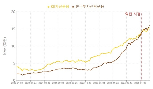(서울=연합인포맥스) 이규선 기자 = 국내 상장지수펀드(ETF) 시장이 200조 원 시대를 목전에 두고 있다. 삼성자산운용과 미래에셋자산운용의 양강 체제 하에서 3위 자리를 두고 KB자산운용(KB운용)과 한국투자신탁운용(한투운용)이 치열한 경쟁을 벌이고 있다. 두 회사의 시장점유율은 비슷하지만, 사업 전략과 수익성 면에서는 확연한 차이를 보인다.