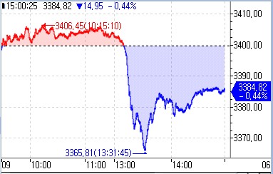 연합인포맥스 세계주가지수(화면번호 6511)에 따르면 이날 상하이종합지수는 전장대비 14.96포인트(0.44%) 내린 3,384.82에 장을 마감했다.