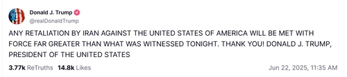 트럼프 대통령은 21일(현지시간) 소셜미디어 트루스소셜을 통해 이란이 무력으로 대응할 경우, 미국은 "오늘 밤 목격한 것보다 훨씬 더 강력한 힘으로 맞설 것"이라고 밝혔다.