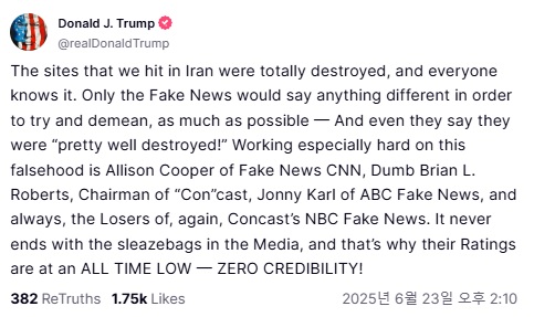 트럼프 대통령은 이날 자신의 소셜 미디어인 트루스소셜에서 이렇게 적으며 "오직 가짜뉴스만이 최대한 폄하하기 위해 다르게 말할 것이다. 심지어 그들조차 '꽤 잘 파괴됐다'고 말하더라"고 설명했다.
