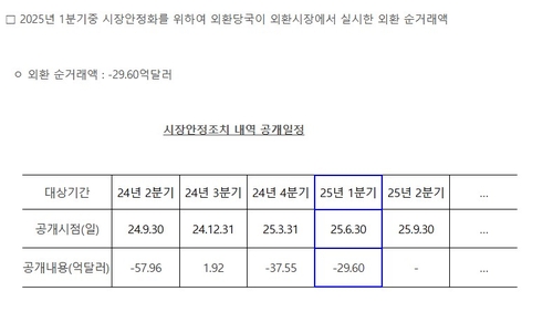 한국은행이 30일 홈페이지에 공개한 지난 1분기 순거래 내력에 따르면 당국은 29억6천만달러를 순매도했다.