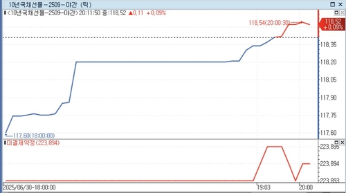 서울채권시장에 따르면 10년 국채선물은 오후 9시 40분 현재 주간 거래 종가대비 9틱 상승한 118.52에 거래됐다.