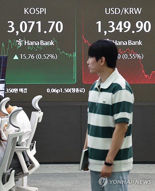 이날 코스피는 전 거래일 대비 15.76p(0.52%) 오른 3,071.70로 마감했다. 원/달러 환율 주간 거래 종가(오후 3시 30분 기준)는 전날보다 원/달러 환율 7.4원 내린 1,350.0원을 기록했다. 2025.6.30 dwise@yna.co.kr