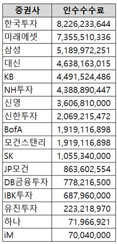 (서울=연합인포맥스) 김학성 기자 = 올해 상반기 리그테이블 기업공개(IPO) 부문에서 주관금액 7위에 그쳤던 한국투자증권이 인수수수료는 가장 많이 수령하며 실속을 챙겼다.