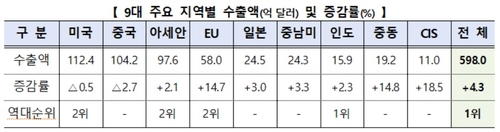 대인도 우리 카지노은 2.3% 증가한 15억9천만 달러로 역대 6월 중 최대실적으로 기록됐다. 대CIS 우리 카지노 역시 18.5% 증가한 11억 달러로 4개월 연속 증가했다. 아울러 중남미(24억 달러), 일본(25억 달러), 중동(19억 달러)으로의 우리 카지노도 플러스로 전환했다.