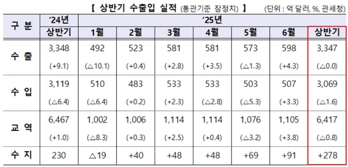 안덕근 산업부 장관은 "올해 상반기 우리 수출은 미국의 관세 조치, 경기 회복세 둔화, 중동 사태 등 전례 없는 글로벌 통상·무역 환경의 불확실성에도 불구하고 전년 수준을 유지했고, 6월에는 역대 최대실적을 기록하면서 플러스로 전환됐다"며 "이는 우리 기업들이 녹록지 않은 수출 여건에 적응하기 위해 치열하게 시장·품목 다변화에 노력한 결과"라고 평가했다.