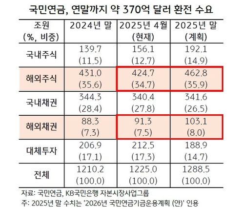 이민혁 KB국민은행 연구원은 1일 보고서에서 "국내기관중에서 가장 큰손인 국민연금의 해외투자를 위한 달러 환전 수요에 주목할 필요가 있다"며 이같이 언급했다.