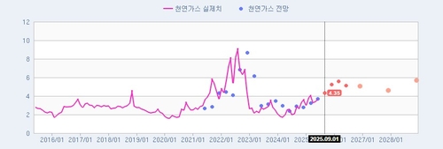 연합인포맥스에 따르면 미국 천연가스 선물 가격은 3분기에 100만BTU(열량단위)당 4.35달러 수준으로 상승할 것으로 예상됐다. 4분기 전망치는 5.25달러로 제시됐다.