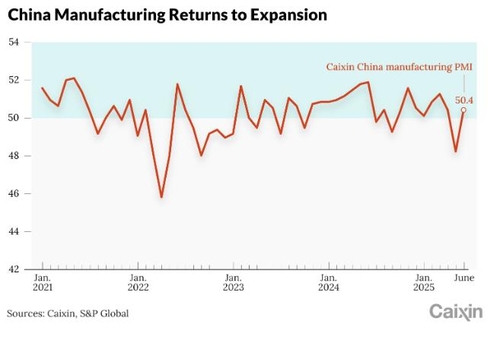 (서울=연합인포맥스) 윤시윤 기자 = 6월 중국 제조업 경기가 1개월 만에 다시 확장세로 돌아섰다. 지난 5월 일시적 위축을 기록했으나 내수 회복과 정책 효과가 나타나며 생산과 수요가 반등했다.