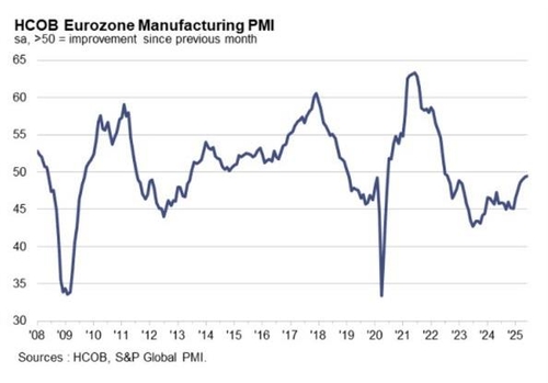 HCOB의 사이러스 드 라 루비아 수석 이코노미스트는 "제조업 부문에서 일부 안정화 조짐이 나타나고 있다"며 "업체들은 4개월 연속으로 생산을 약간 확대했으며 주문량 감소가 멈췄다. 배송 기간이 약간 연장된 것도 수요가 약간 회복되고 있음을 나타낸다"고 말했다.