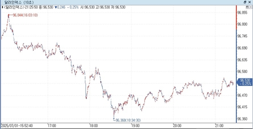 연합인포맥스(화면번호 6411)에 따르면 1일 오전 8시23분께(이하 미 동부시간) 뉴욕 외환시장에서 주요 6개 통화에 대한 달러 가치를 반영하는 달러인덱스(DXY)는 96.534로 전장 마감 가격(96.831)보다 0.297포인트(0.306%) 떨어졌다.