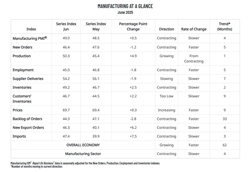 수전 스펜스 ISM 이사회 의장은 "6월 미국 제조업 활동은 위축이 둔화했으며 재고 및 생산 개선이 제조업 PMI의 0.5포인트 상승에 가장 큰 요인으로 작용했다"고 했다.