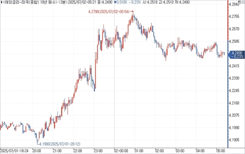 연합인포맥스의 해외금리 일중 화면(화면번호 6532)에 따르면 1일(미국 동부시간) 오후 3시 현재 뉴욕 채권시장에서 10년물 국채금리는 전 거래일 오후 3시 기준가 대비 2.20bp 상승한 4.2490%에 거래됐다.