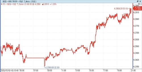 연합인포맥스의 해외금리 일중 화면(화면번호 6532)에 따르면 2일(미국 동부시간) 오전 8시 현재 뉴욕 채권시장에서 10년물 국채금리는 전 거래일 오후 3시 기준가보다 4.50bp 오른 4.2940%를 기록하고 있다.