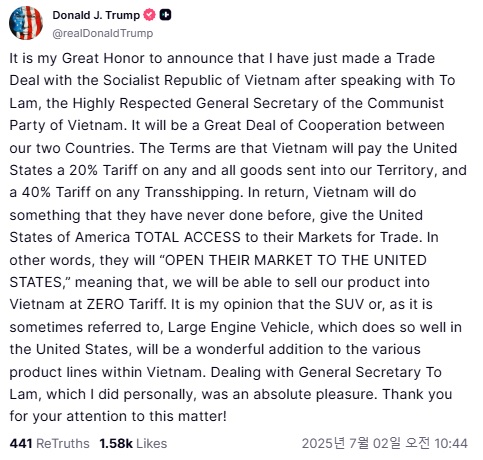 트럼프 대통령은 이날 자신의 소셜 미디어인 트루스 소셜에 "베트남의 공산당 서기장인 토 람과 대화한 후, 방금 무역협정을 체결했음을 발표하게 돼 매우 영광이다"고 했다.