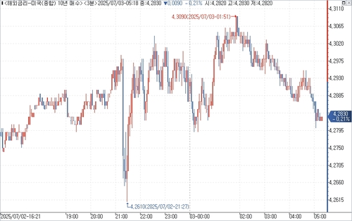 연합인포맥스의 해외금리 일중 화면(화면번호 6532)에 따르면 2일(미국 동부시간) 오후 3시 현재 뉴욕 채권시장에서 10년물 국채금리는 전 거래일 오후 3시 기준가 대비 4.20bp 상승한 4.2910%에 거래됐다.