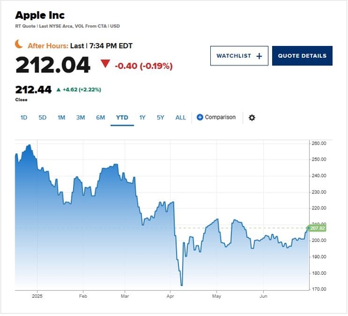 이날 애플은 정규장에서 2.22% 오른 212.44달러에 마감했고, 시간외거래에선 0.19% 내린 212.04달러에 거래됐다.