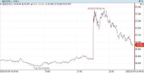연합인포맥스(화면번호 6411)에 따르면 3일 오전 9시43분께(이하 미 동부시간) 뉴욕 외환시장에서 주요 6개 통화에 대한 달러 가치를 반영하는 달러인덱스(DXY)는 97.006으로 전장 마감 가격(96.750)보다 0.256포인트(0.265%) 상승했다.