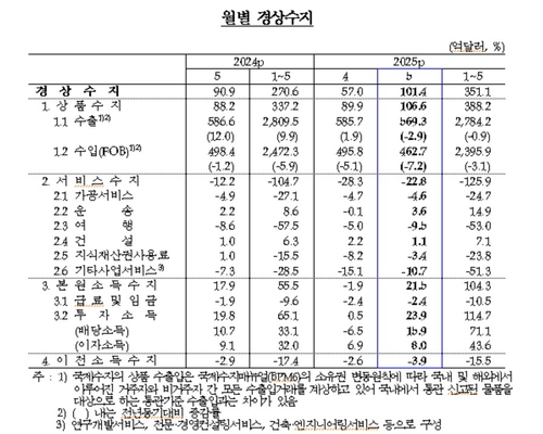 한국은행이 4일 발표한 국제수지 잠정치에 따르면 지난 5월 경상수지는 101억4천만 달러 흑자를 기록했다.