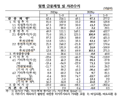 주식투자가 37억8천만달러로 전월 88억달러보다 줄었다. 반면, 채권(부채성증권)투자는 63억1천만달러로 전월 35억3천만달러보다 증가했다.