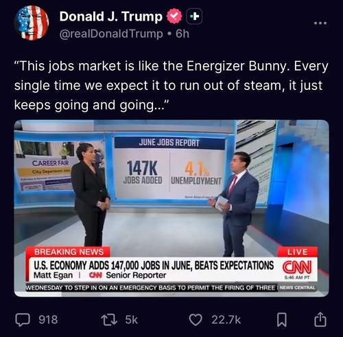 도널드 트럼프 미국 대통령은 온라인카지노 지표 발표 직후 자신의 소셜미디어 트루스소셜에 "지금 온라인카지노시장은 마치 에너자이저 토끼 같다. 매번 동력이 다할 거라고 예상하지만 계속해서 나아가고 또 나아가고 있다"고 적었다.