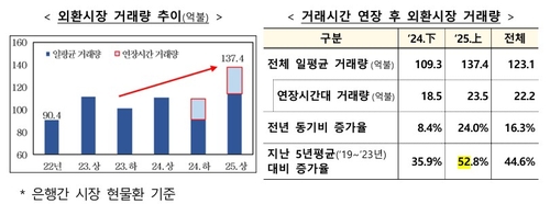 작년 하반기 일평균 거래량은 109억3천만달러였으나 올해 상반기 거래량은 137억4천만달러로 확연히 늘었고, 연장 시간대 거래량도 18억5천만달러에서 23억5천만달러로 증가했다.