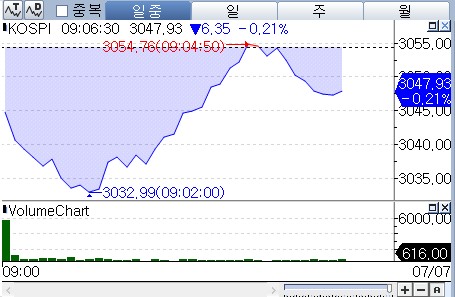 7일 연합인포맥스 신주식종합(화면번호 3536)에 따르면 오전 9시 6분 기준 코스피는 전 거래일보다 6.35포인트(0.21%) 내린 3,047.93에서 거래 중이다.