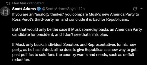 애덤스는 "당신이 유추적인 사고를 하는 사람이라면 머스크의 새로운 '아메리카당'을 공화당에 불리하다고 결론지을 수 있다"면서도 "그러나 그런 일이 실제로 벌어지려면 머스크가 아메리카당의 대통령 후보를 지지해야 하는데, 그의 계획에서 그런 점은 보이지 않는다"고 지적했다.