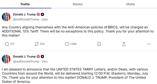 트럼프 대통령은 이날 자신의 소셜미디어 계정을 통해 이같이 말하며, "브릭스(BRICS)의 반미 정책에 동조하는 모든 국가에는 10% 추가 관세가 부과되고, 예외는 없다"고 덧붙였다.