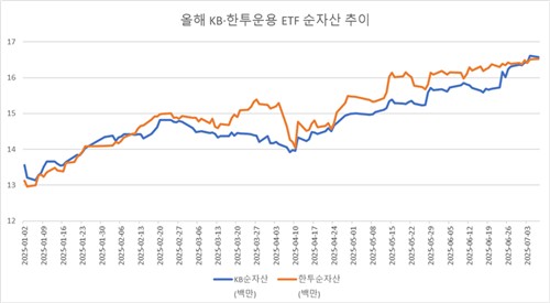 지난 1월 양사는 같은 날 나란히 순자산 14조 원을 돌파했다. 처음엔 KB운용이 3위로 앞서갔지만, 한투운용이 순자산 15조 원을 먼저 달성해 순위가 역전됐다.