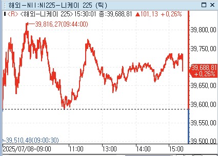 연합인포맥스 세계주가지수(6511)에 따르면 닛케이225 지수는 전 거래일 대비 101.13포인트(0.26%) 오른 39,688.81에 장을 마감했다.