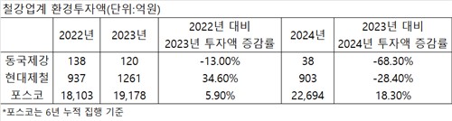 연합인포맥스가 9일 국내 주요 철강사 3곳이 발간한 지속가능경영보고서를 분석한 결과, 지난해 동국제강[001230]과 현대제철[004020]은 환경 투자 규모를 전년 대비 줄인 것으로 나타났다.