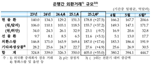 2분기 국내 은행간 시장의 일평균 외환거래 규모는 405억달러로 전분기의 350억달러에 비해 55억달러 증가했다.