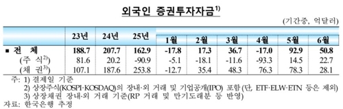 주식자금은 올해 들어 4월까지 순유출이 지속했으나 5월과 6월 각각 14억5천만달러, 22억7천만달러 순유입됐다. 새 정부 정책에 대한 기대감으로 외국인 투자심리가 개선됐다.