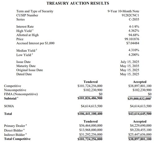미국 재무부는 9일(현지시간) 오후 장 들어 입찰을 실시한 뒤 390억달러 규모 10년물 국채의 발행 수익률이 4.362%로 결정됐다고 발표했다. 지난달 입찰 때의 4.421%에 비해 5.9bp 낮은 수준이다.