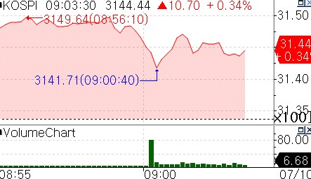 10일 연합인포맥스 신주식종합(화면번호 3536)에 따르면 오전 9시 3분 코스피가 전 거래일보다 10.70포인트(0.34%) 상승한 3,144.44를 나타냈다. 코스닥은 전 거래일보다 3.64포인트(0.46%) 오른 794.00을 기록했다.