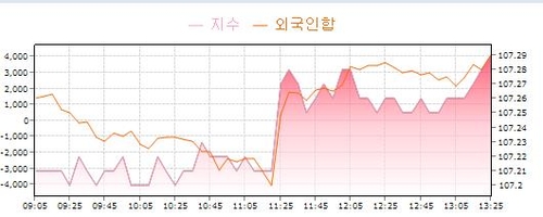 서울 채권시장에 따르면 3년 국채선물은 이날 오후 1시25분 현재 전일 대비 13틱 오른 107.28을 기록했다. 외국인이 4천100여계약 순매수했고 은행은 약 4천800계약 순매도했다.