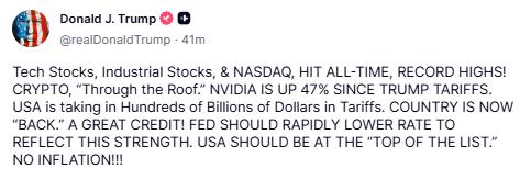 트럼프 대통령은 "암호화폐는 지붕을 뚫었다. 트럼프 관세 이후 엔비디아는 47% 상승했다. 미국은 관세로 수천억달러를 벌어들이고 있다"고 설명했다.