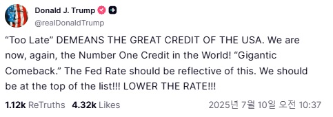 트럼프 대통령의 별도의 게시물에서는 "'너무 늦는(파월을 지칭)'은 미국의 위대한 신용을 훼손하고 있다"면서 "우리는 이제 다시 세계 최고의 신용국가다. '놀라운 재기'다"고 썼다.